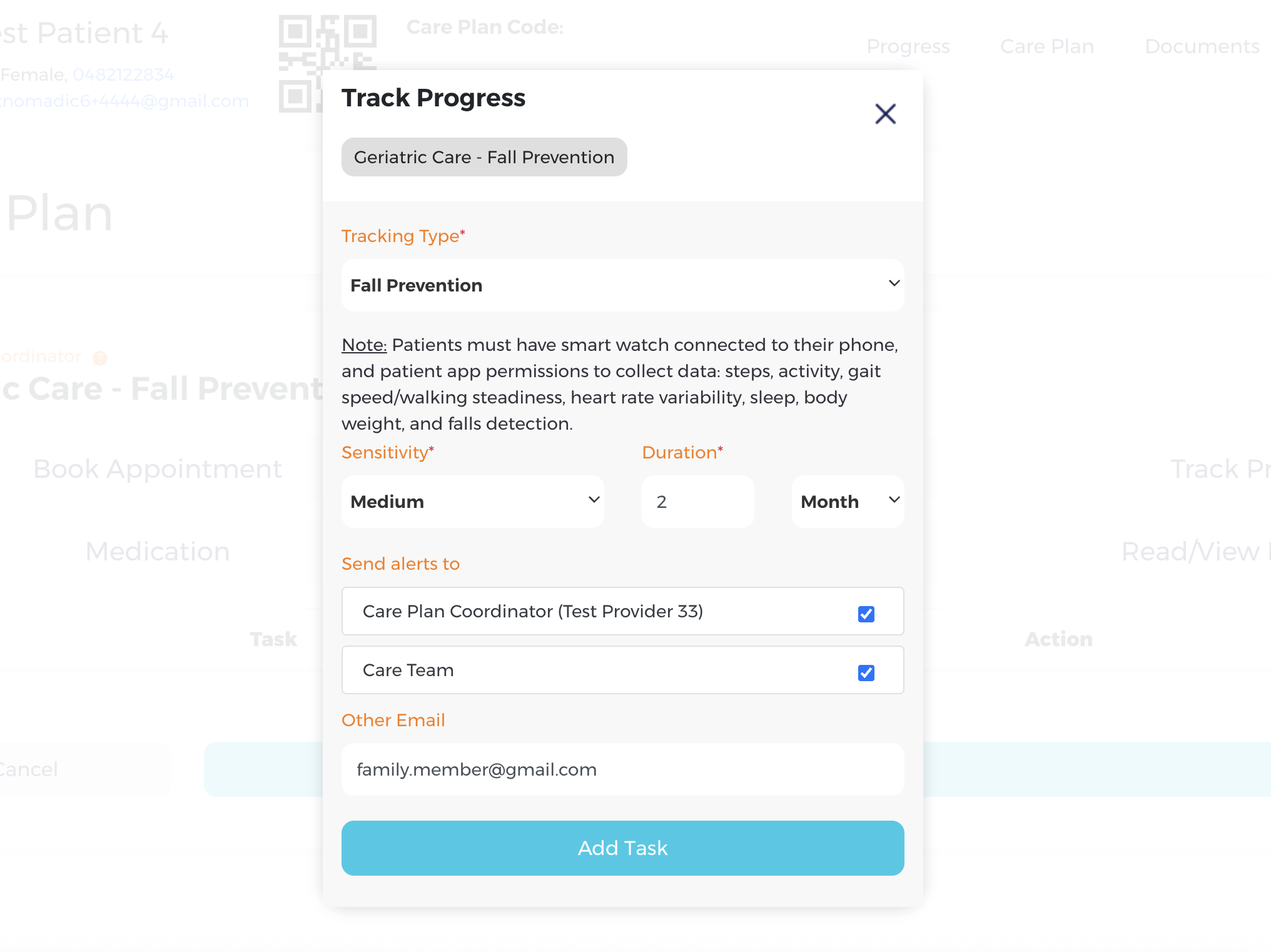 Fall Prevention monitoring is only enabled once a care plan coordinator adds it to the patient’s care plan.