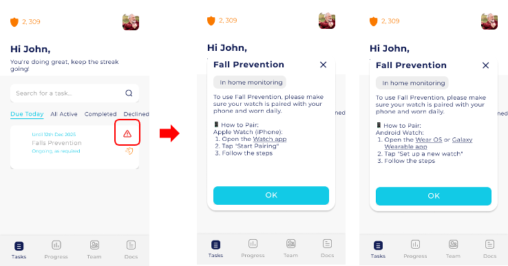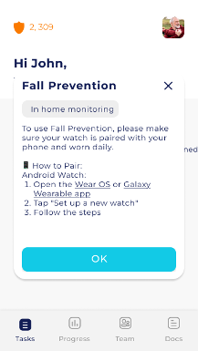 Fall Prevention is a background task that monitors walking activity, heart rate, sleep, medication adherence, and more using smartwatches or fitness trackers.