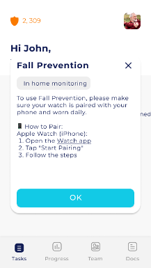 Fall Prevention is a background task that monitors walking activity, heart rate, sleep, medication adherence, and more using smartwatches or fitness trackers.