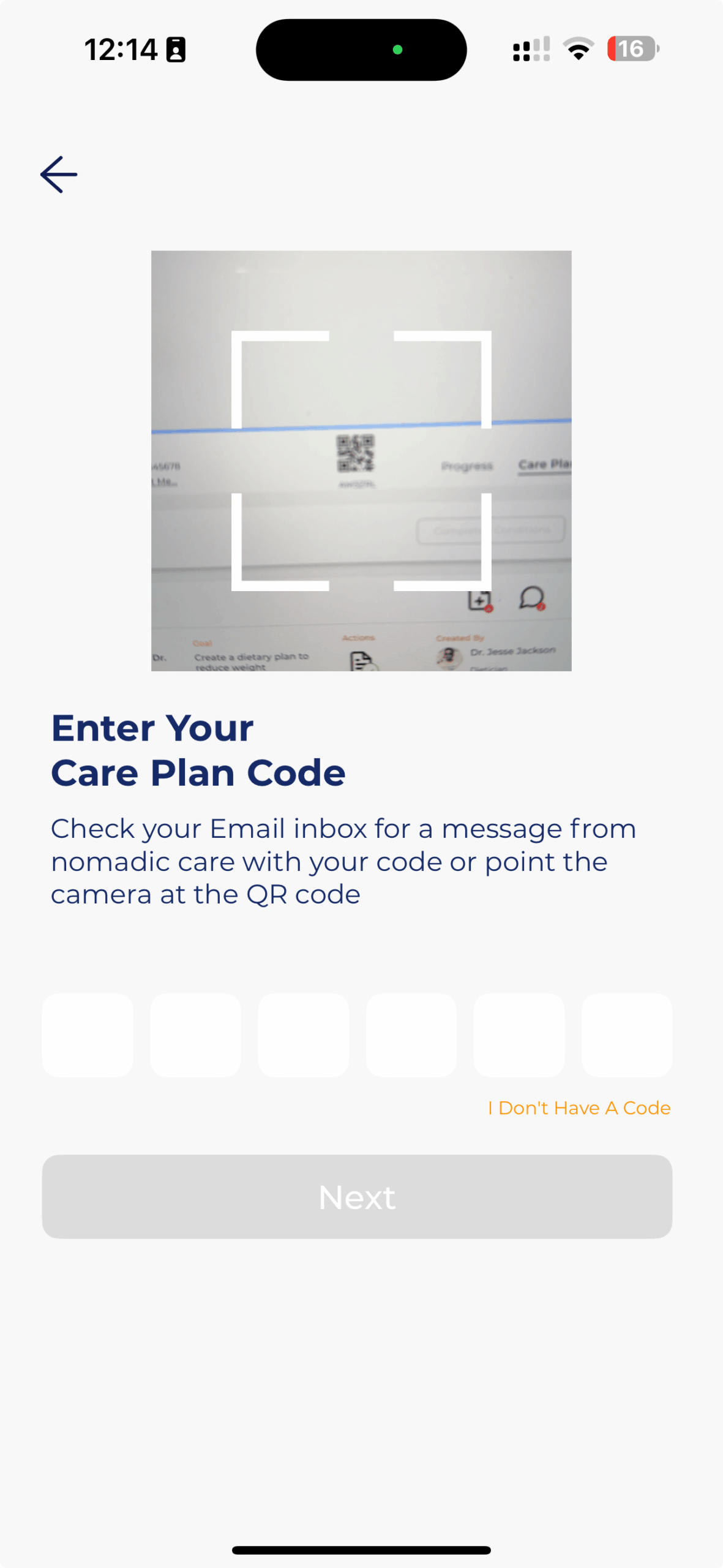 - When running the Nomadic Care app for the first time, the patient / client enters the 6 character care plan code sent to them in their email. If they are with their provider, then they can directly scan a QR code from the provider portal, or they can copy the code from the email sent to them