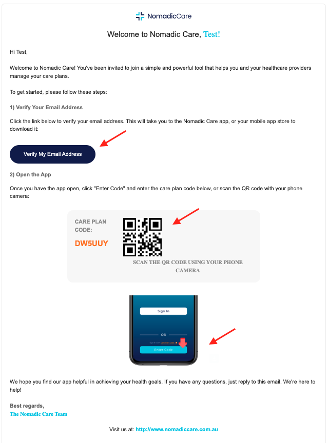 - The patient / client receives an email invitation to Nomadic Care, with a link to verify the email address used to setup the account