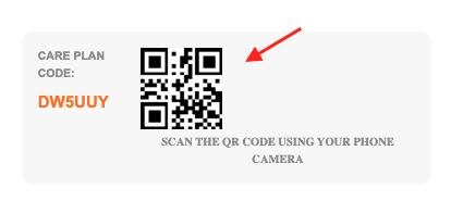 You can also scan the QR code from the patient record visible on the provider dashboard. This is done by selecting “Enter Care Plan Code” from main screen, and using the camera to scan the QR code: