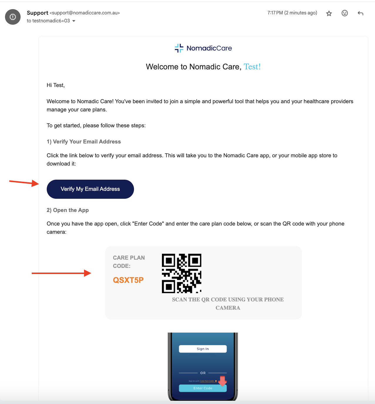 4. The patient / client then checks their email address (as entered in “Email Address” field in step 3). This welcome email will guide the patient on how to verify their account, and login to the Nomadic Care patient app for the first time.