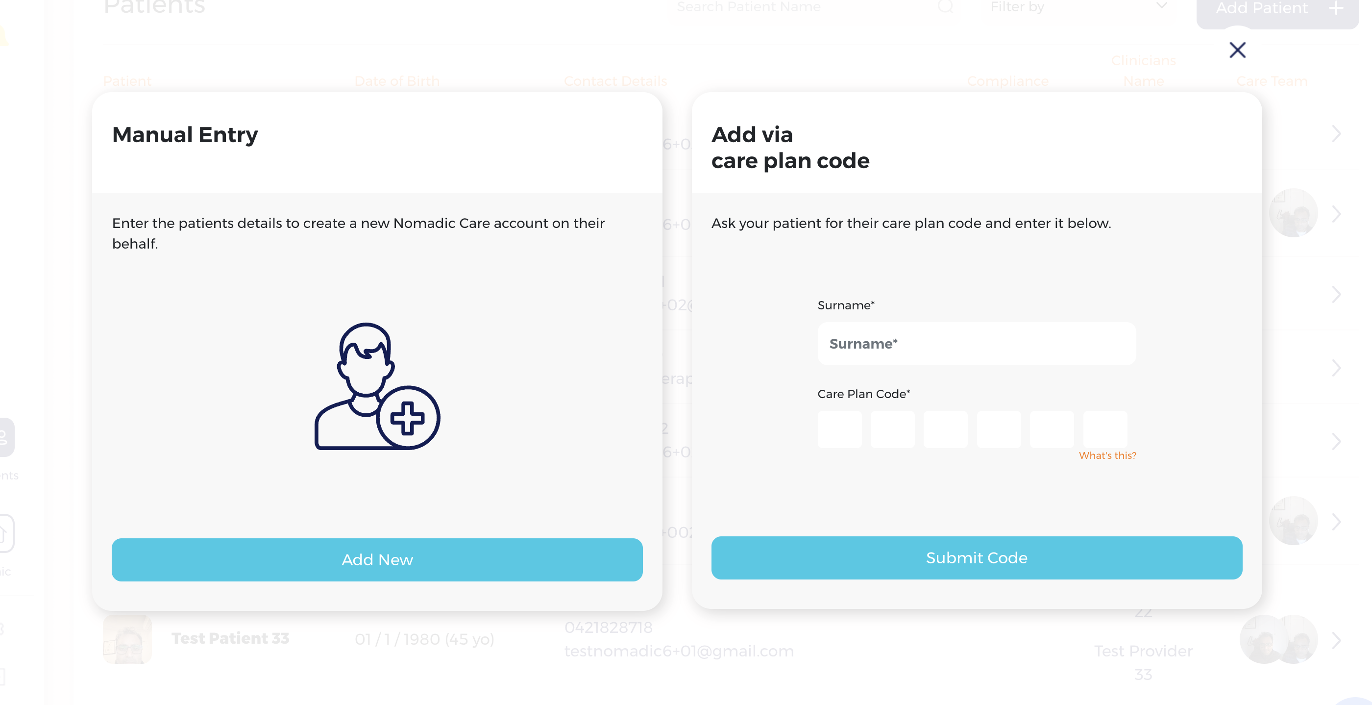 2. If the patient already exists in Nomadic Care (i.e. they are a patient at another practice registered with Nomadic Care), then you can quickly add them to your practice by entering their surname and care plan code in the right-side pane: “Add via Care plan code”.