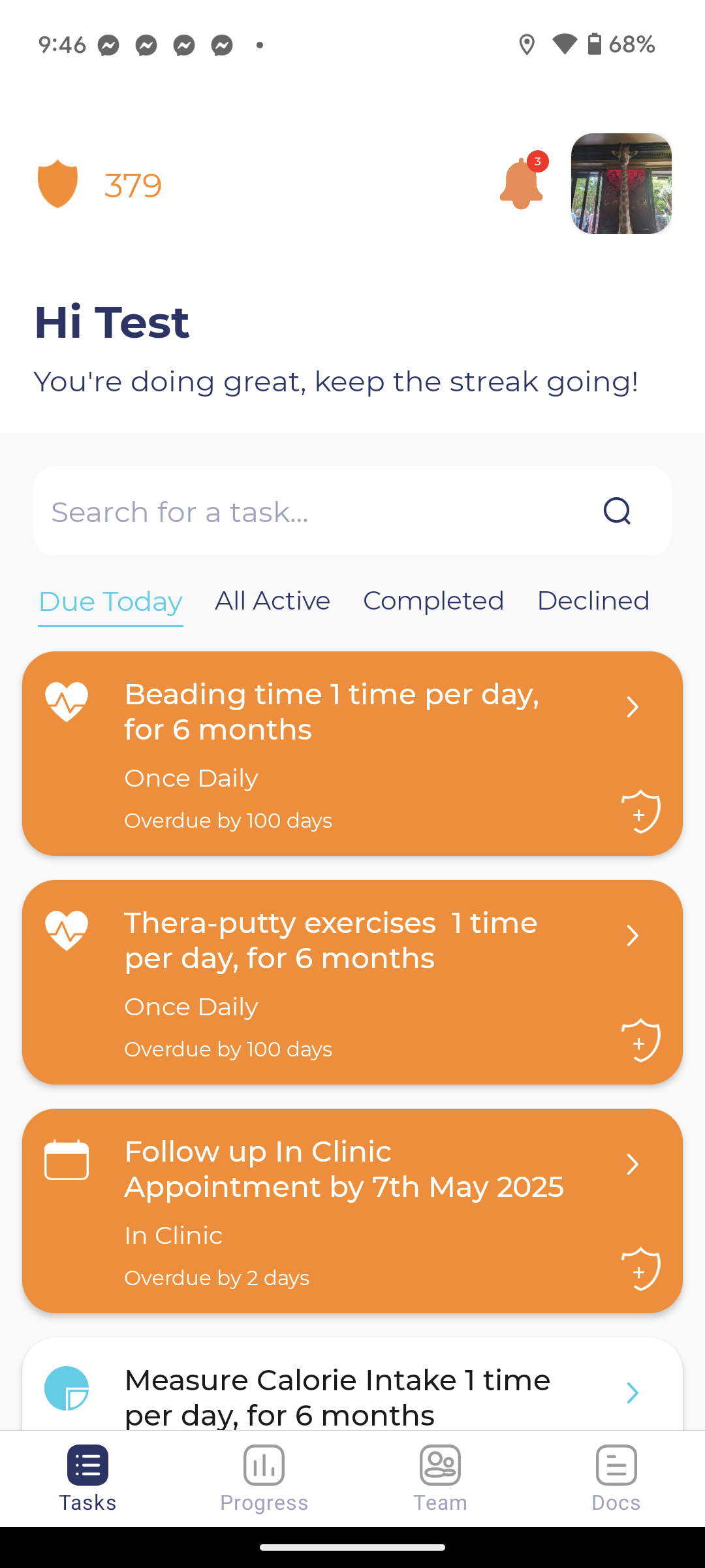 Patients / Clients can also view a summary of how they are doing across all their tasks. This is a useful screen to assure them that they are on track, or if they need some assistance from their primary carer.